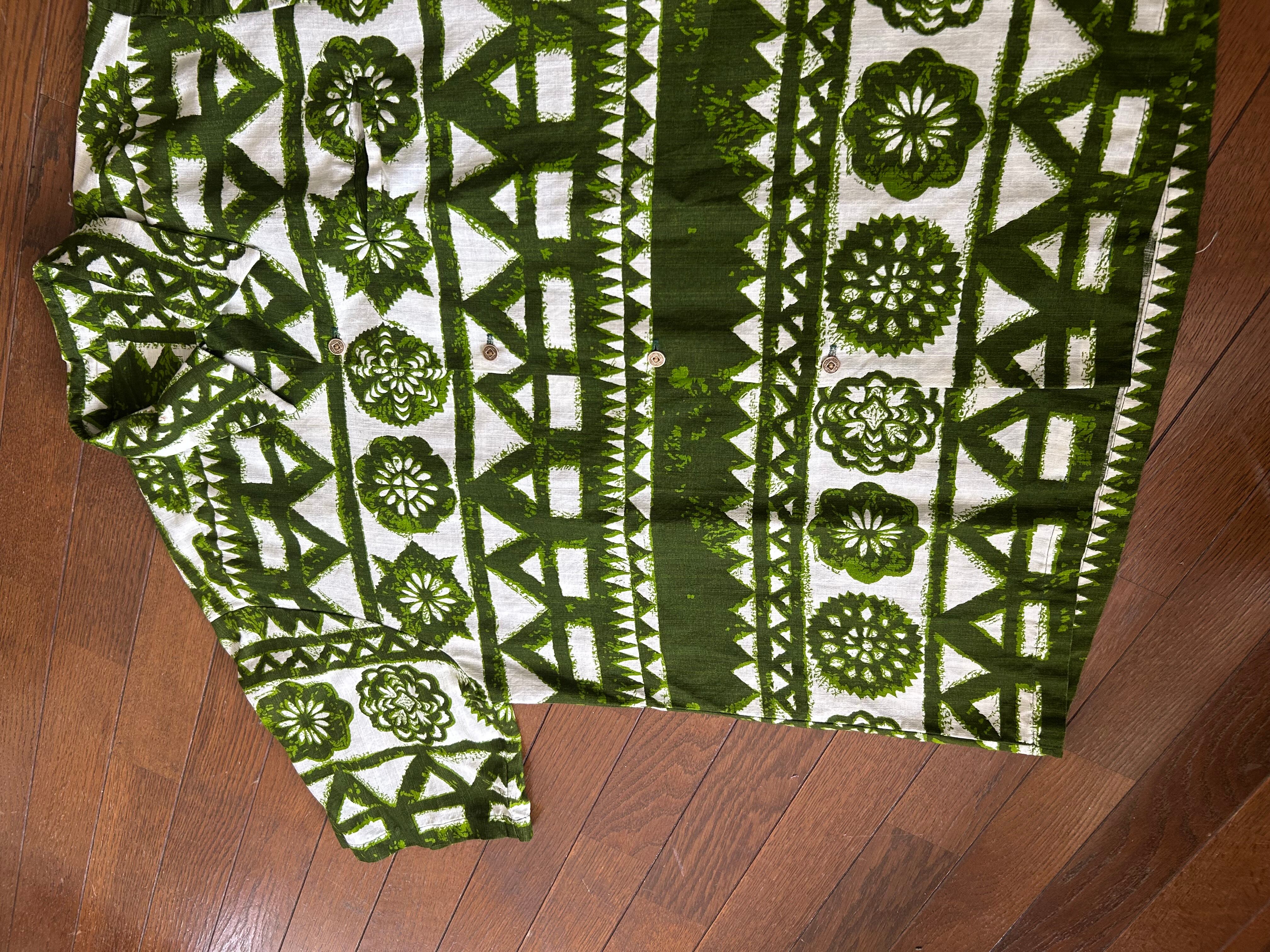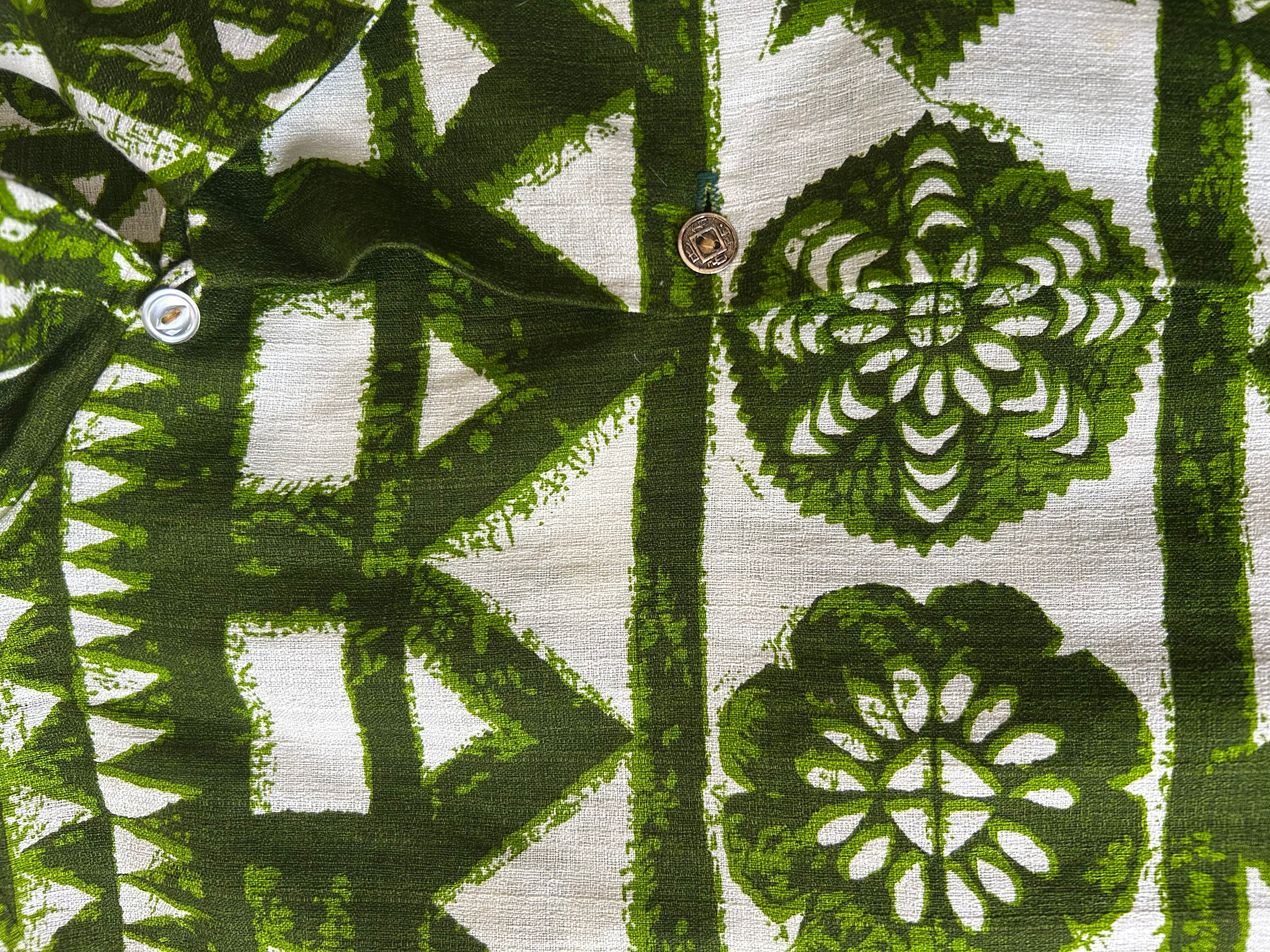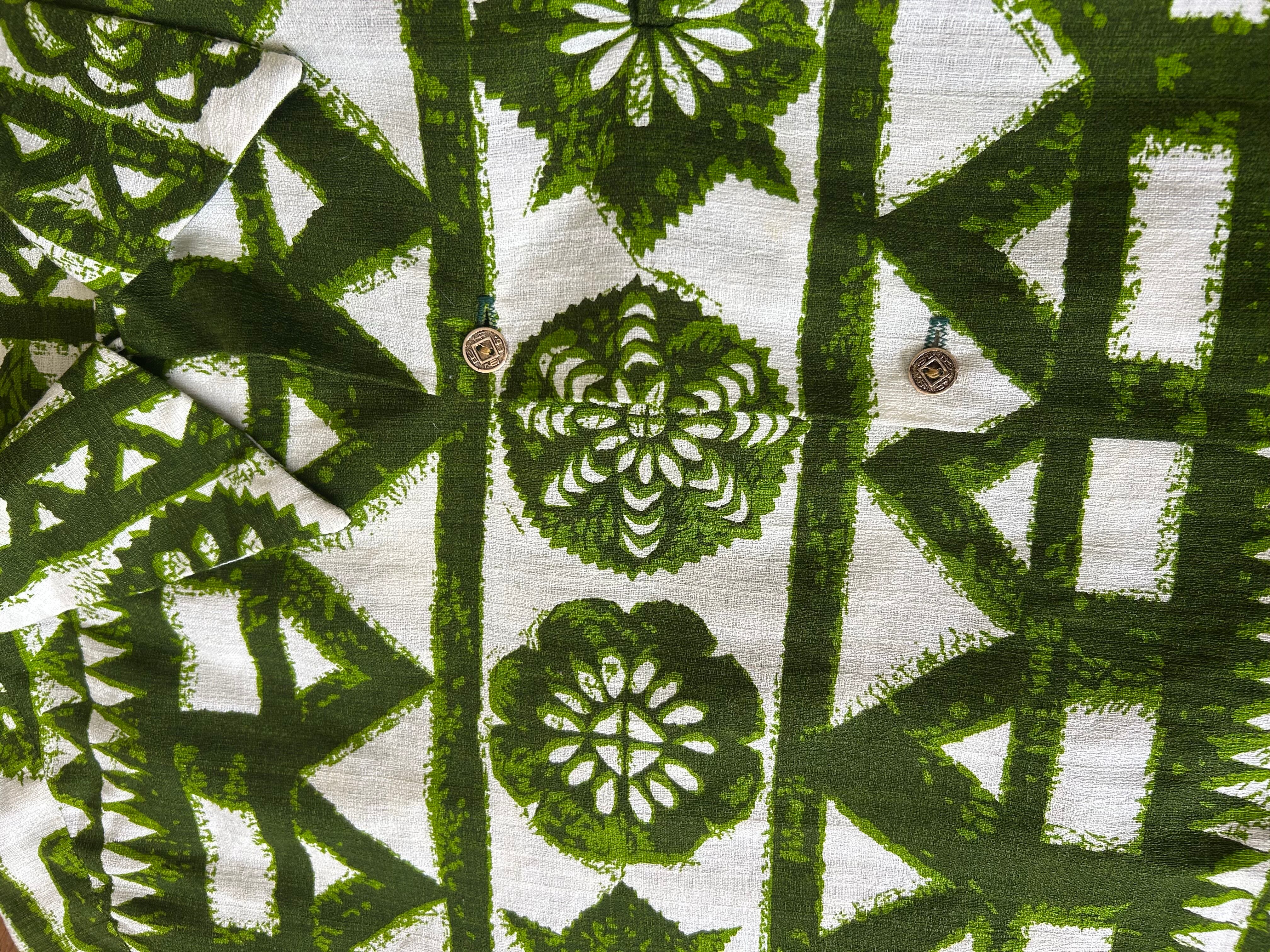 タグがないためブランド不明ですが銭ボタン使用のアロハシャツになります。
