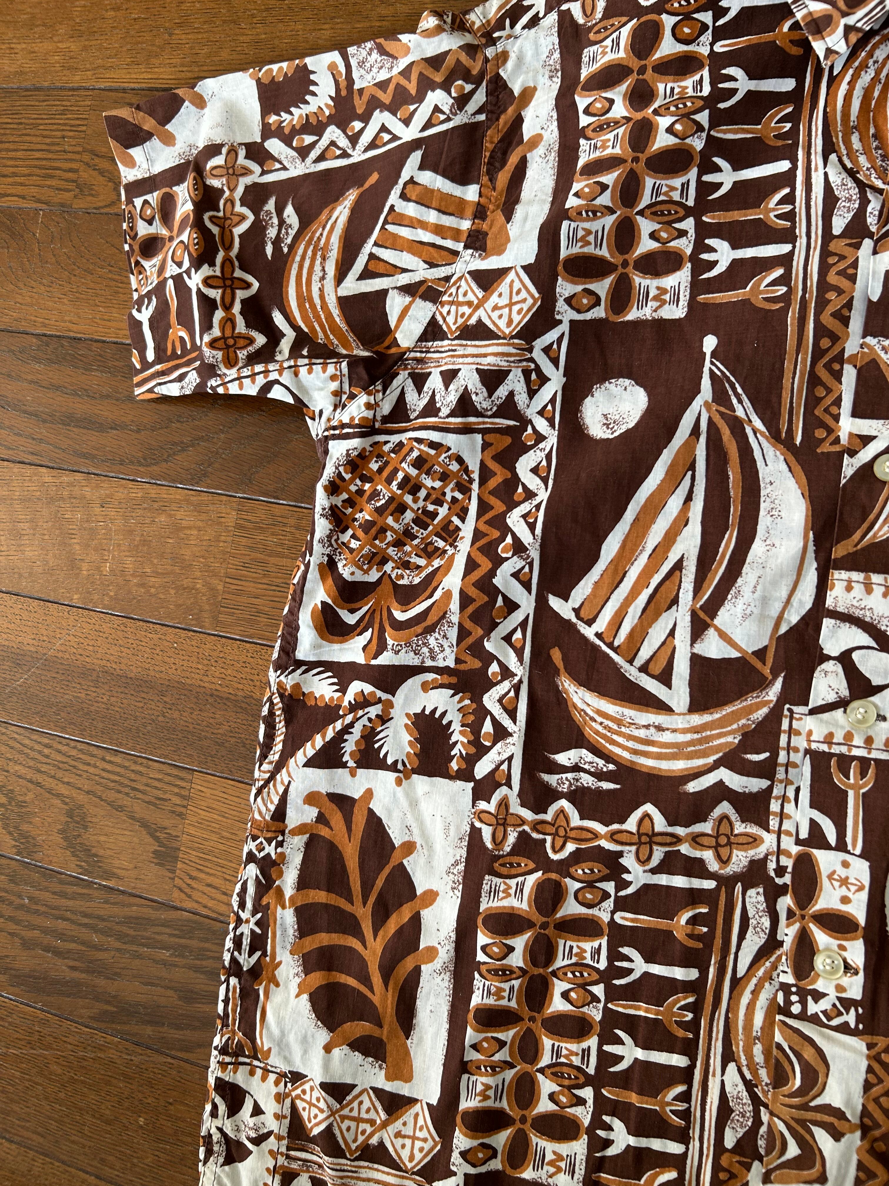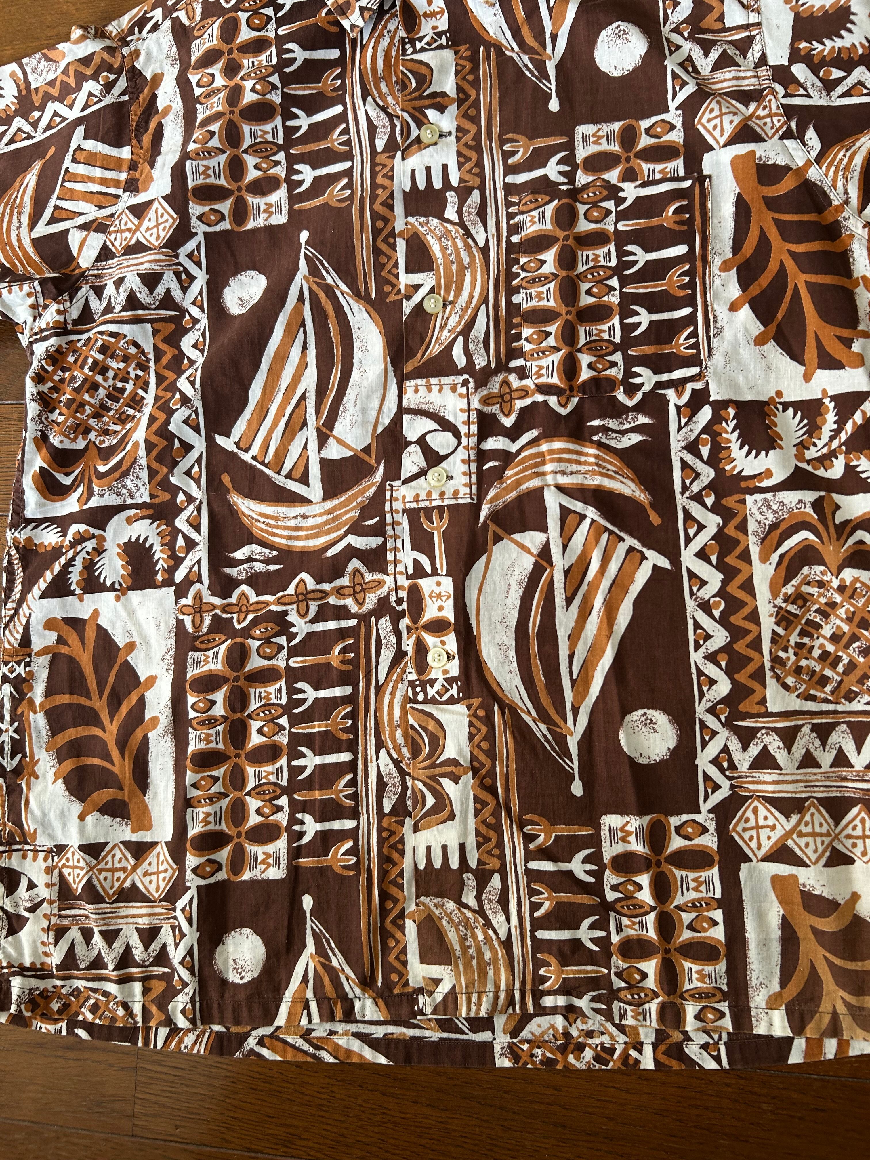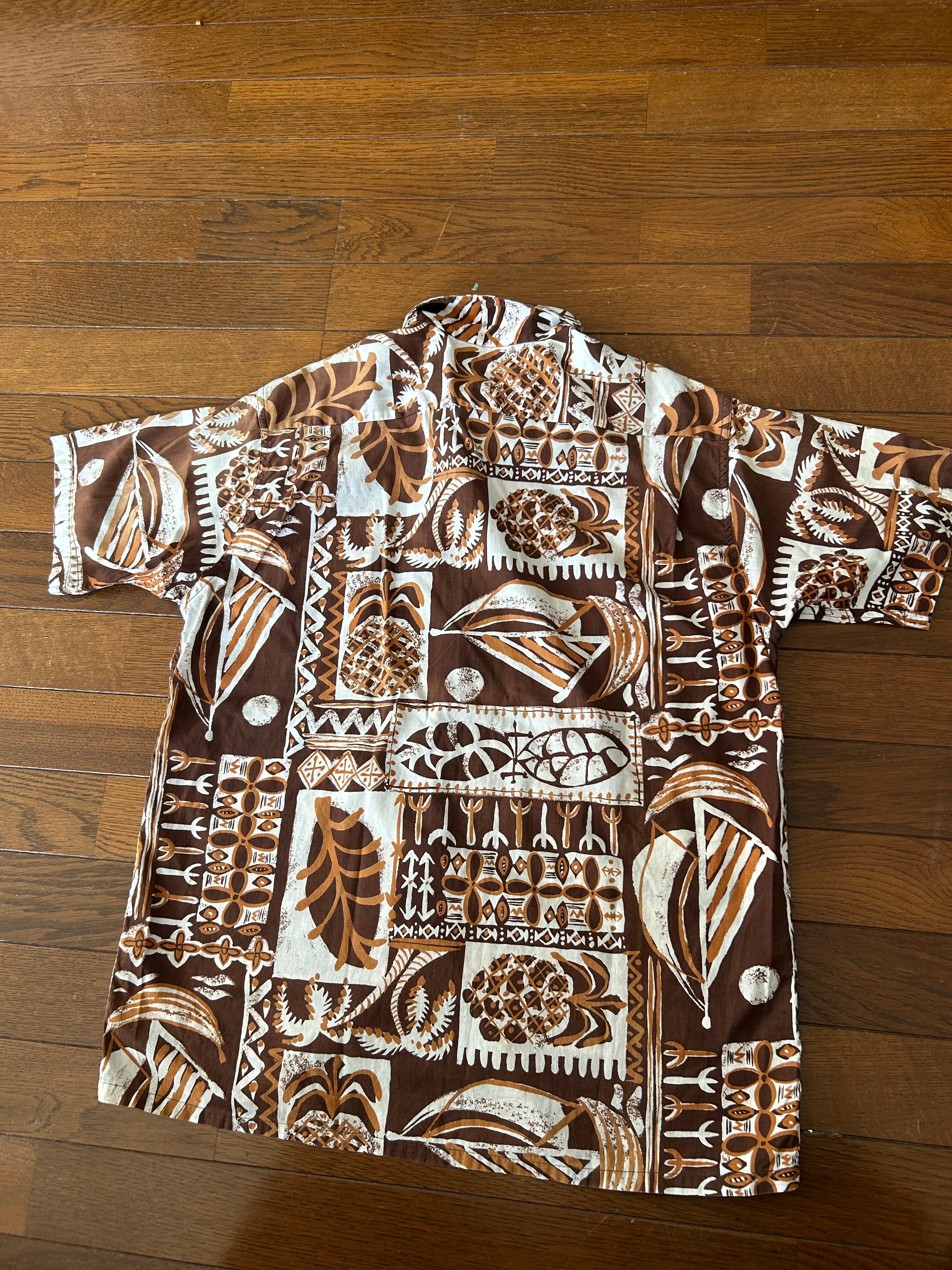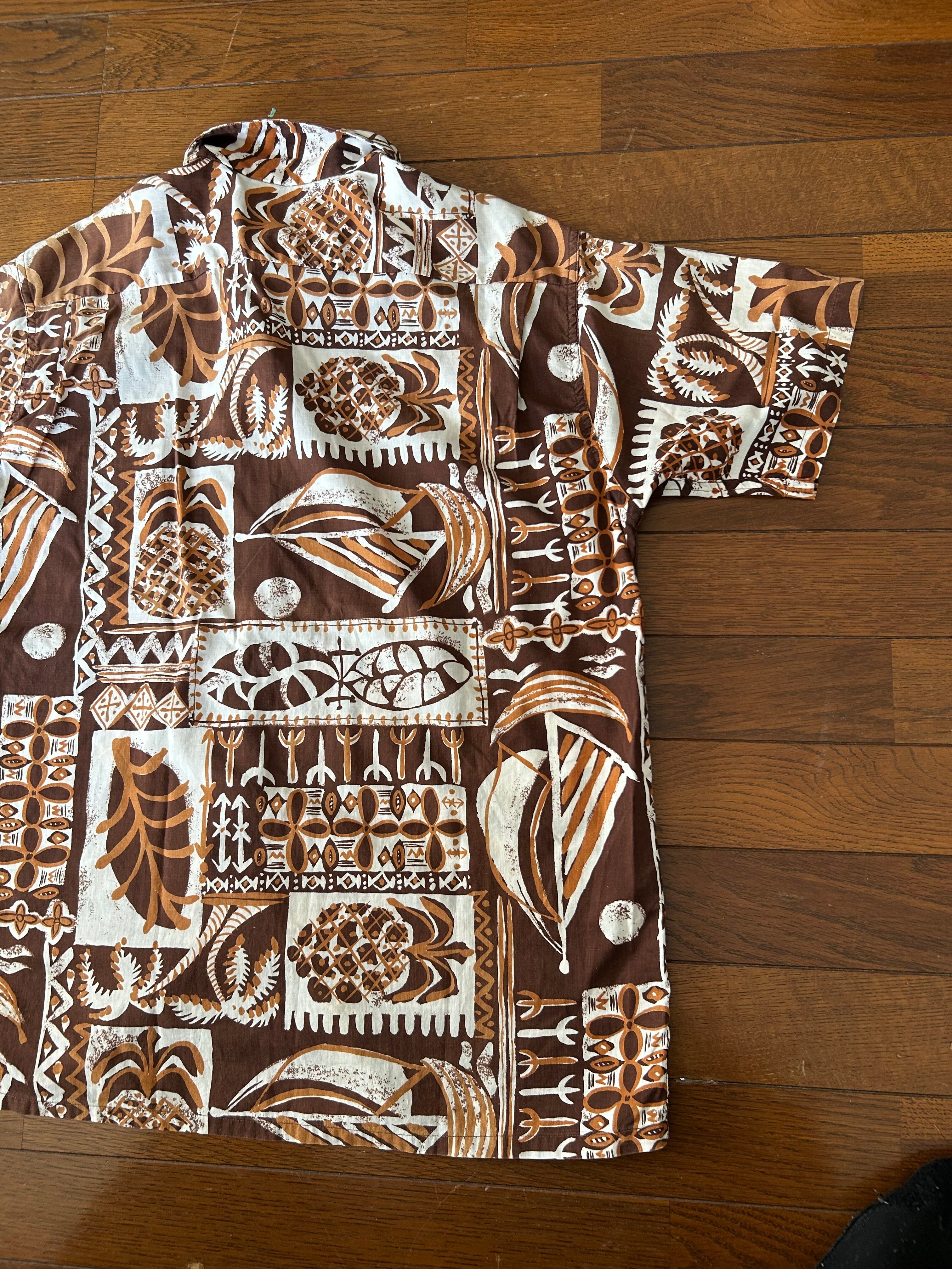 ブラウンベースの柄がおしゃれなアロハシャツになります。個人的にパイナップルが付くのが好きで集めていた品です。
