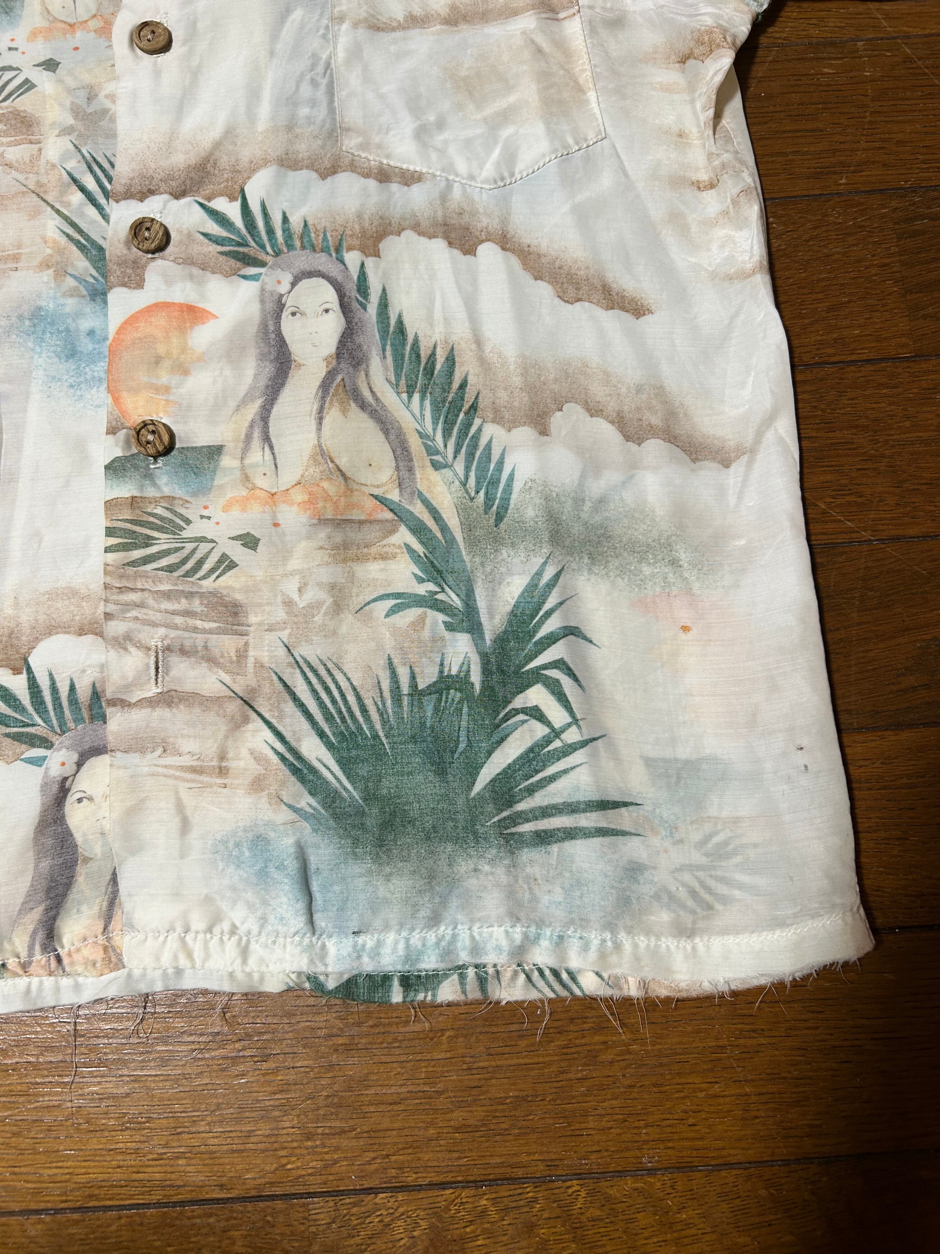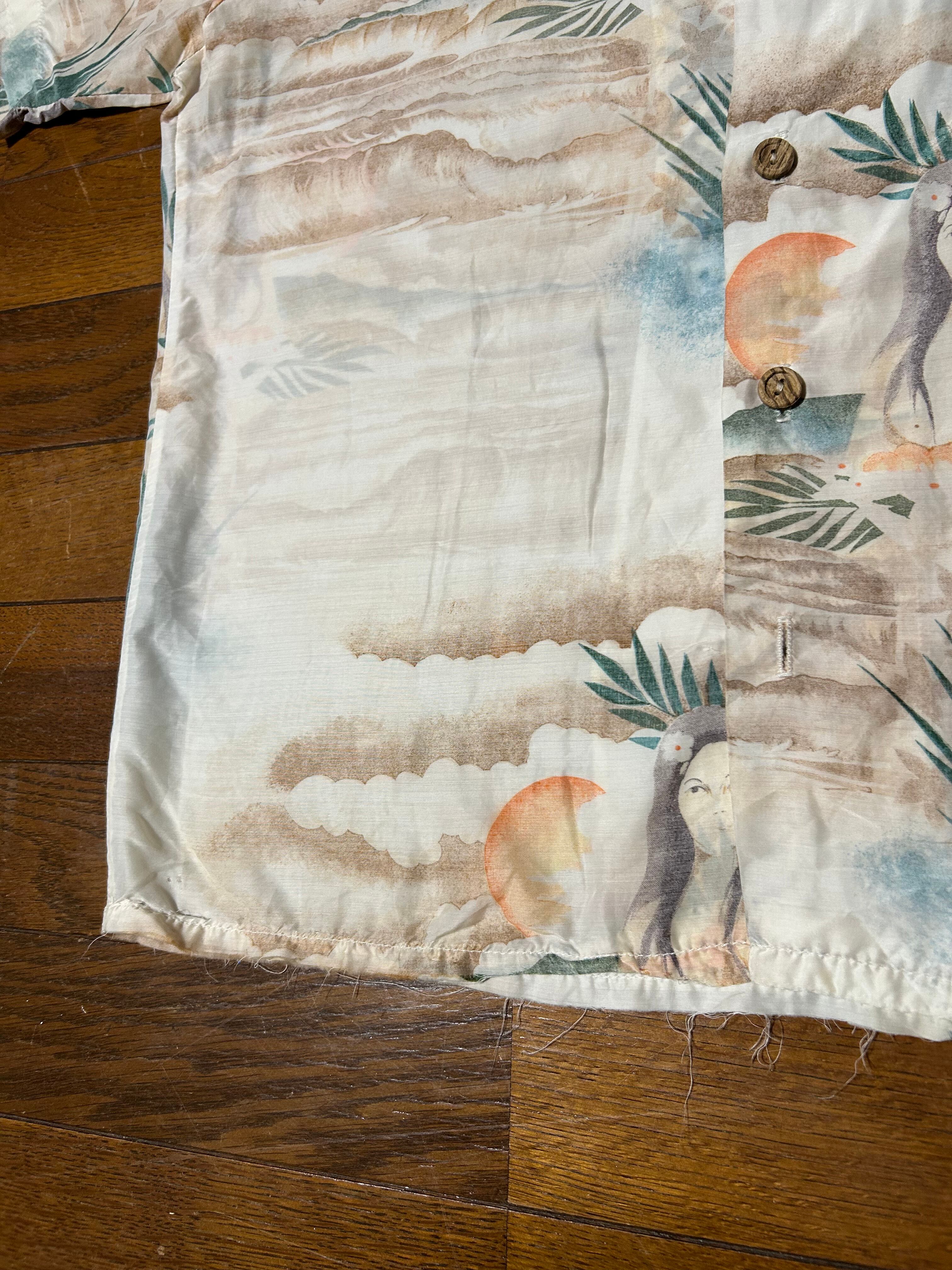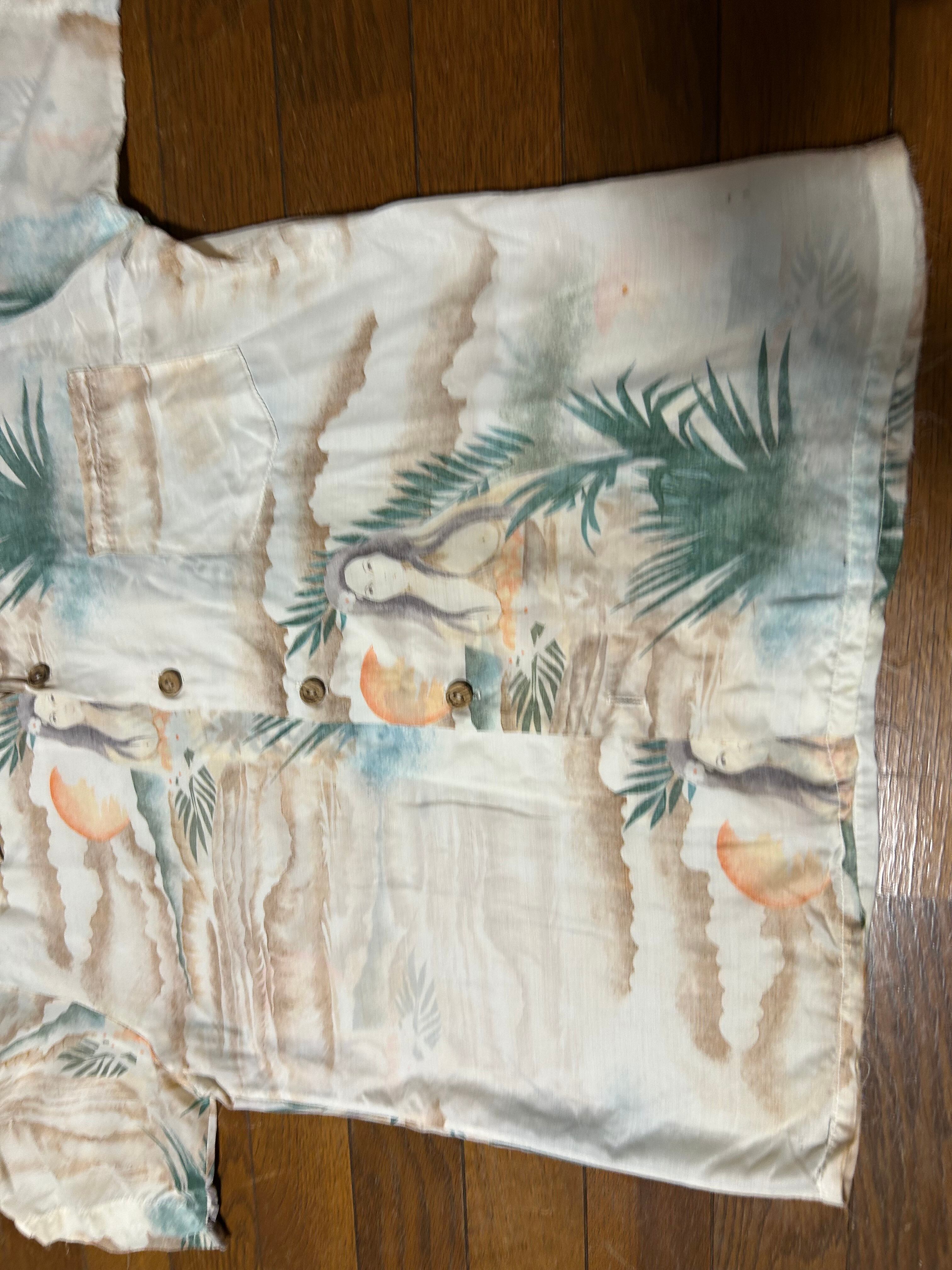 オーシャンパシフィック プリントシャツになります。柄最高に良いですがダメージ多数です。 ポリ混なのでタタキリペアは難しいです。